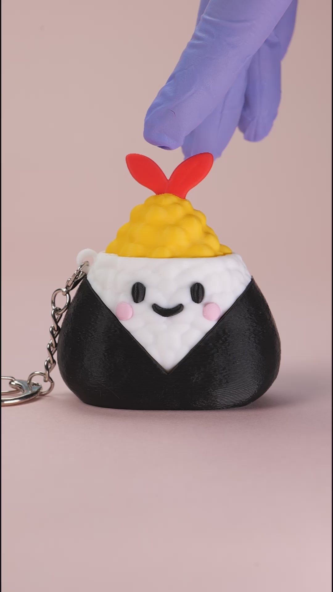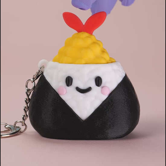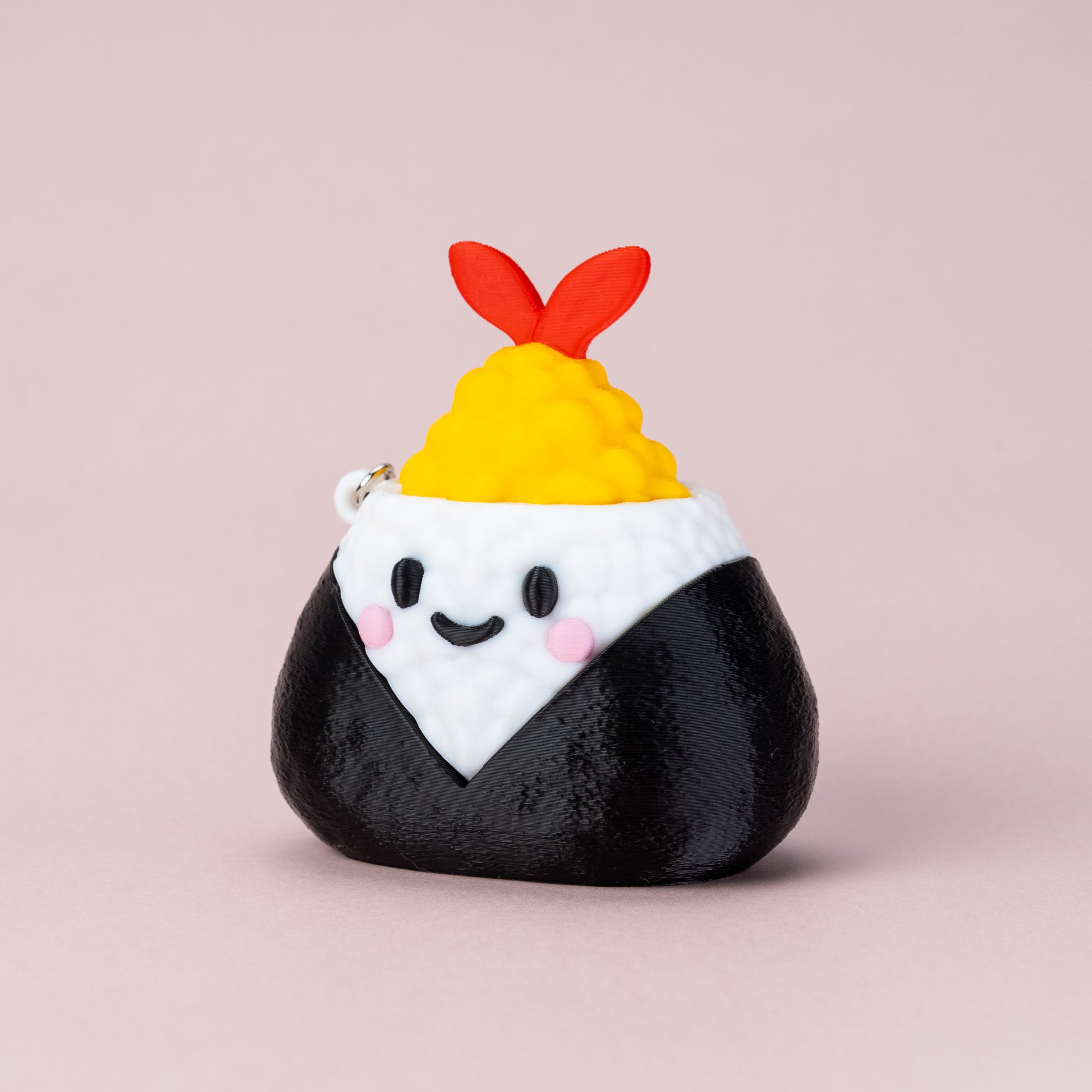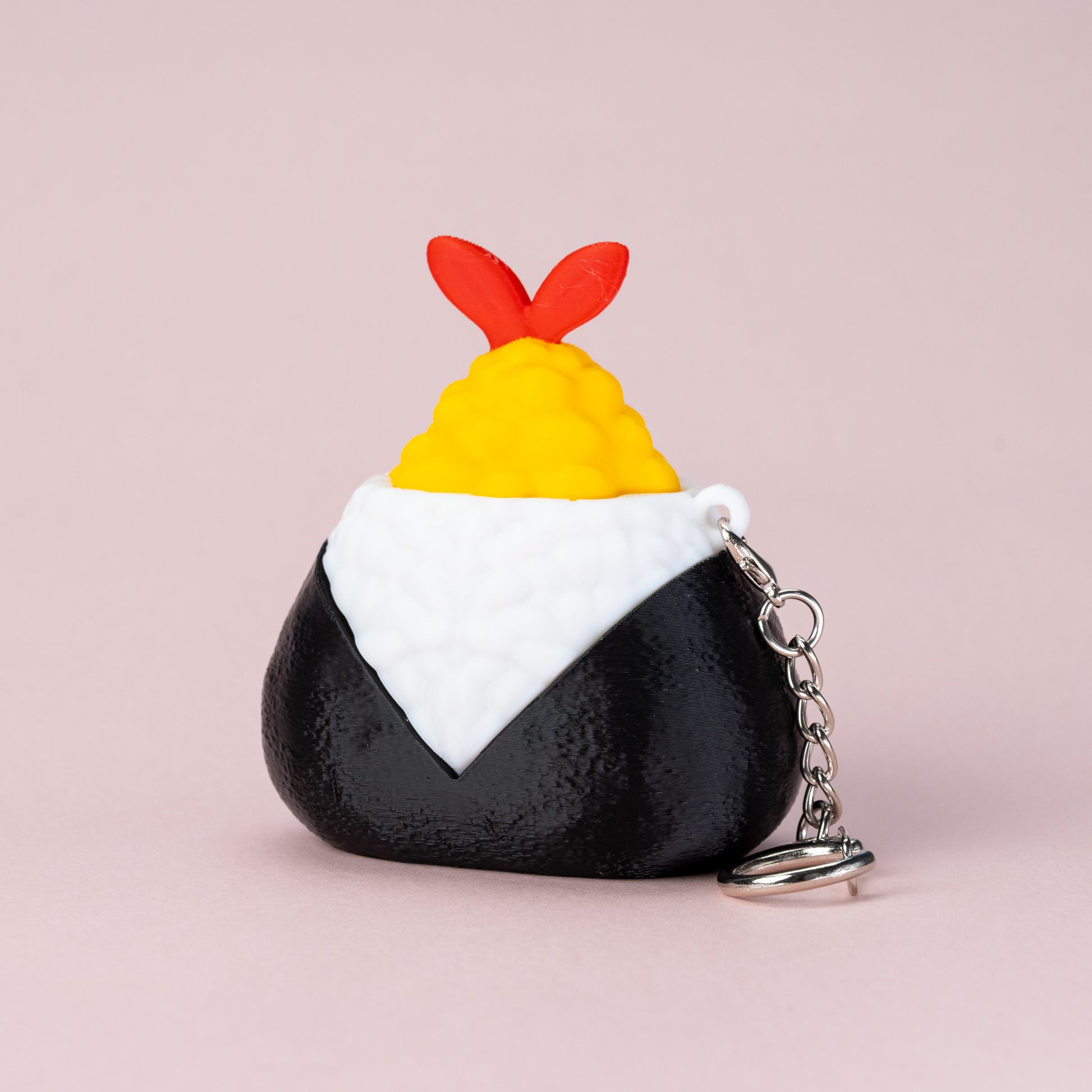 天むす(えび天おにぎり)モチーフの、3Dプリント製クリッカーキーホルダーです。 海苔に包まれたおにぎりのフォルムに、上からえび天のしっぽがちょこんと飛び出したデザイン。